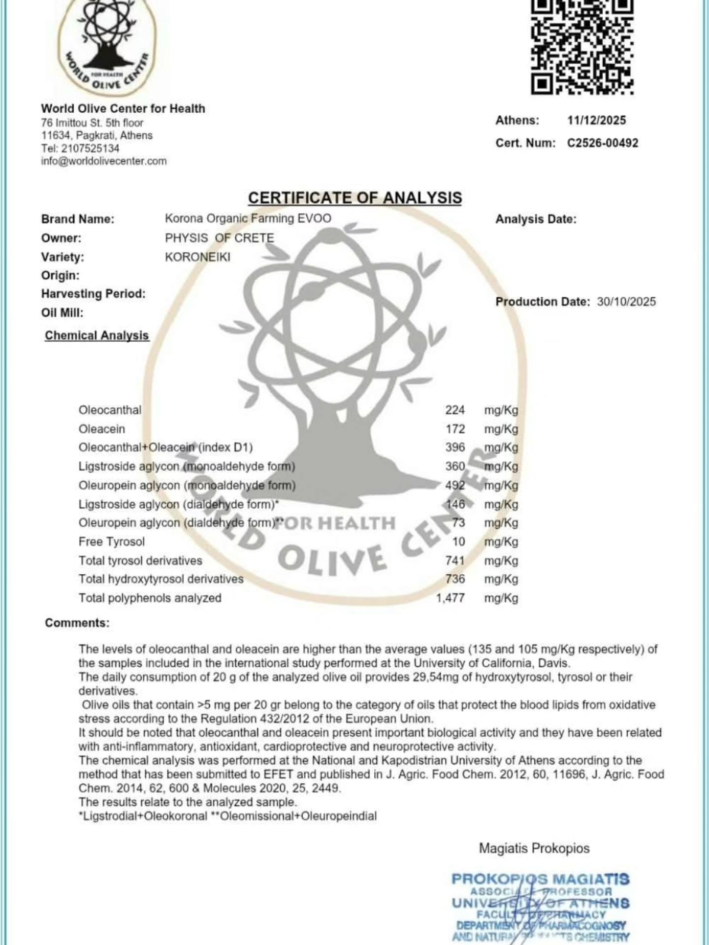 Enthält alle Vitamine und Provitamine des Olivenöls, Mineralstoffe und Polyphenole, die die Zellen vor oxidativem Stress, reaktiven Sauerstoffspezies und freien Radikalen schützen.